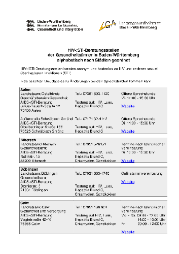 Die Beratung und Testung auf sexuell übertragbare Infektionen findet in Baden-Württemberg durch die STI-Beratungsstellen der Gesundheitsämter und Landratsämter als Pflichtaufgabe statt.